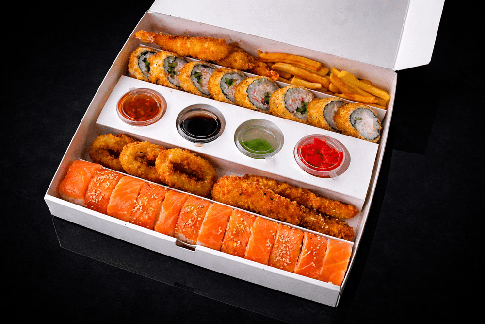 Filadelfiya Kaliforniya Tempurada krab 3 kalmar, 3 karides, 3 nağets Kartof fri
