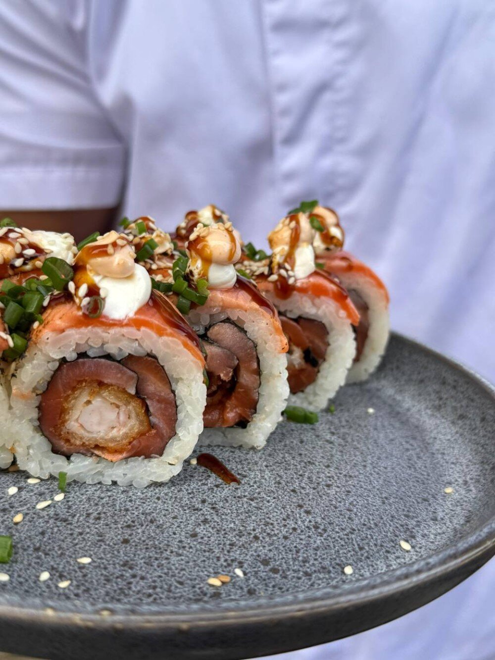 Qızılbalıq, xəmirdə karides, xüsusi sous, krem pendir, çəhrayı sous, xiyar, küncüt, unaqi sousu, yaşıl soğan.