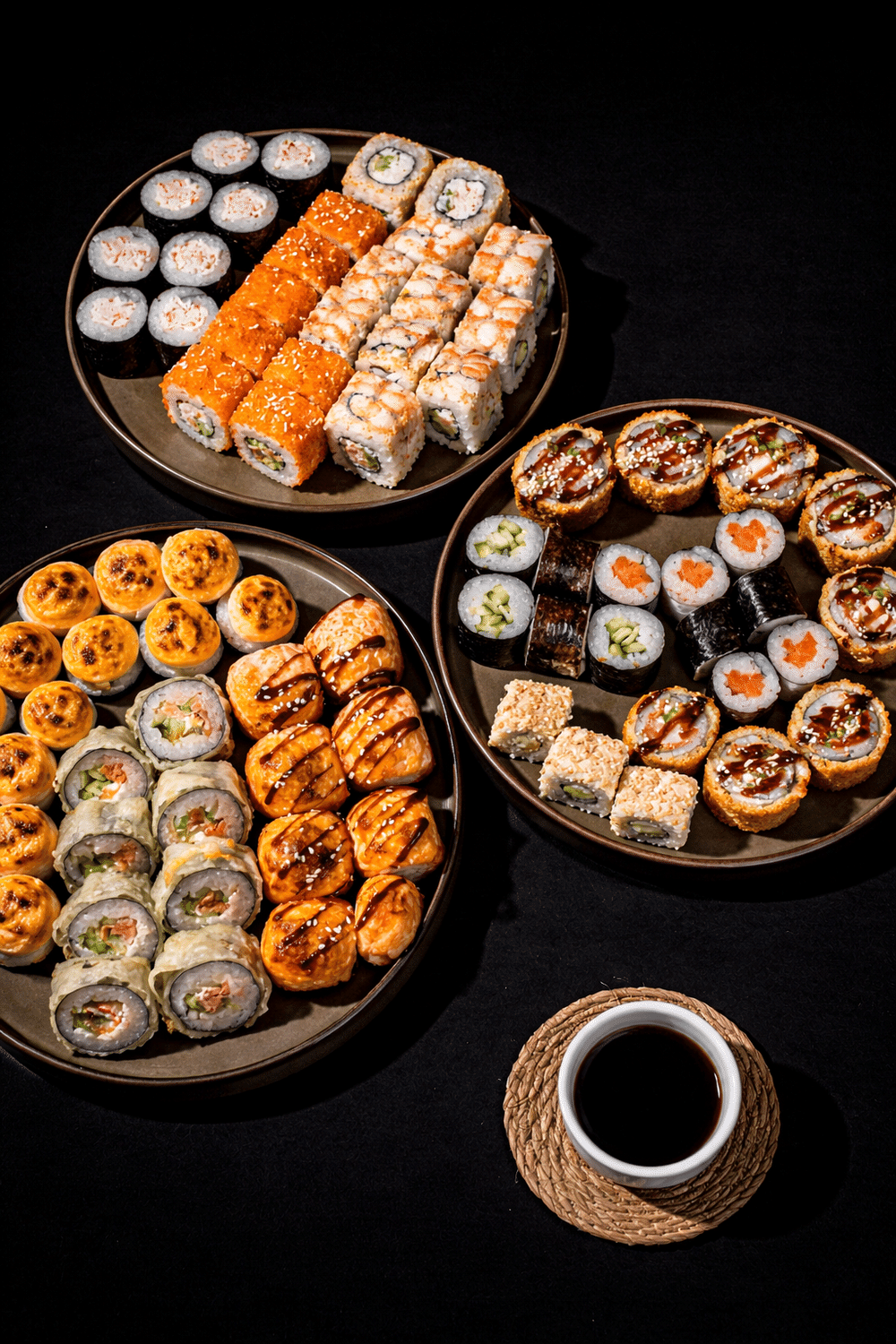 Filadelfiya, qaridesli Filadelfiya, Kaliforniya, zərif somon tempura, krab tempura, roll tempura, midiyalı bişmiş roll, toyuqlu bişmiş roll, mozzarella ilə örtülmüş bişmiş Kaliforniya, mini somonlu, mini krablı, mini xiyar ilə