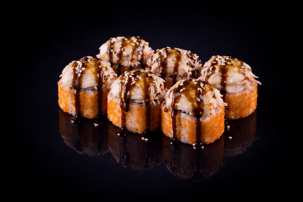 Qar dəniz məhsulu, masago kürüsü, Mozzarella pendiri, avokado, xiyar, krem pendir, Unagi sousu