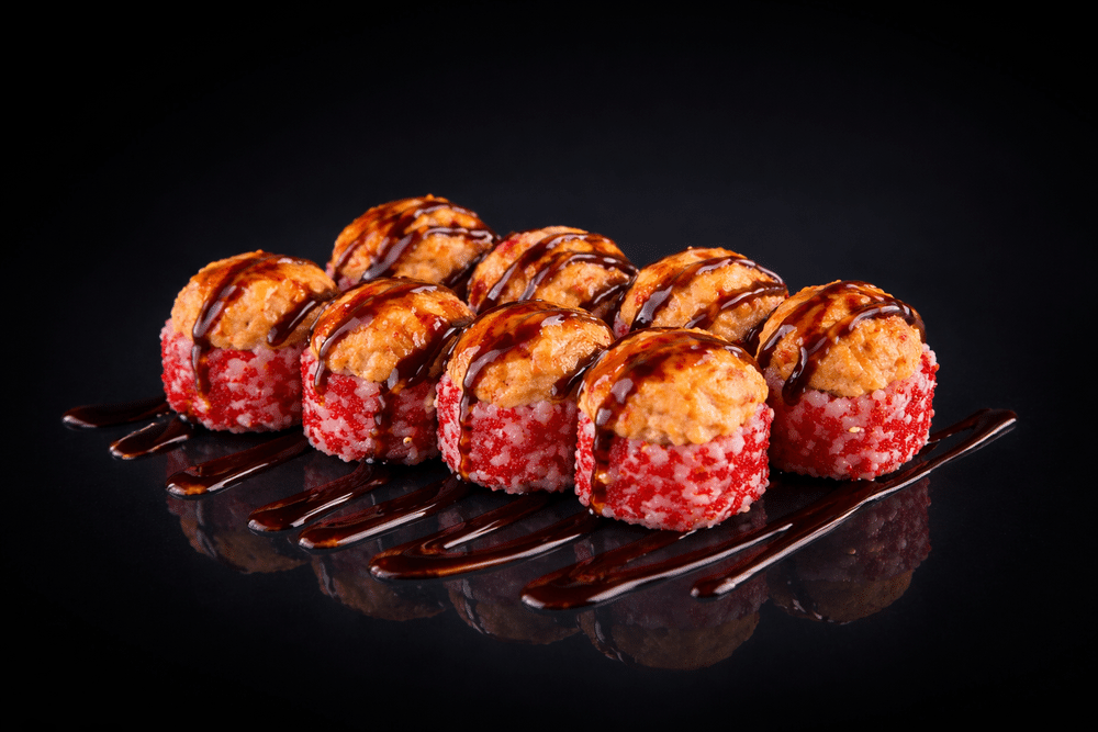 Xiyar, krem pendir, tamago omleti, qarides, masago kürüsü, avokado, Spicy sous, Unagi sousu
