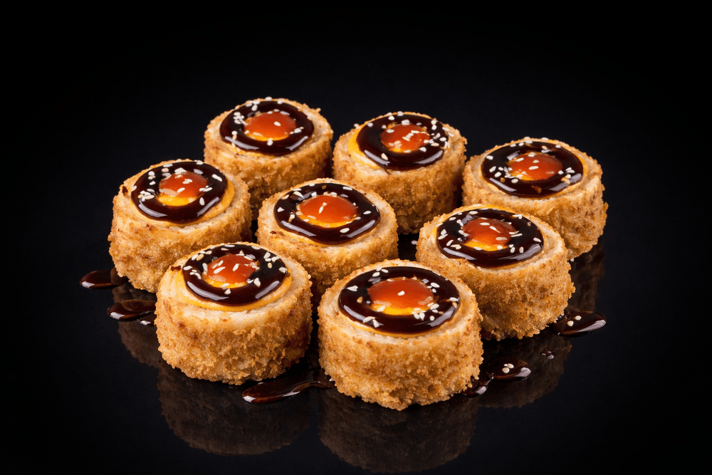 Tempura qarides, avokado, krem pendir, Qızılı sous