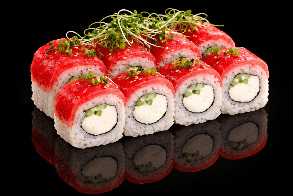 Tuna balığı, kəsmik pendir, xiyar, mikroyaşıl