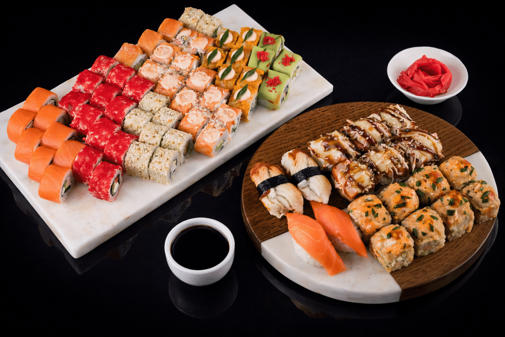 Filadelfiya, Qril Filadelfiya, Kaliforniya, Snək Roll, Acılı Toyuq, Bişmiş Kaliforniya, Vitamin, Avokadolu roll, 2 somon nigiri, 2 qarides nigiri