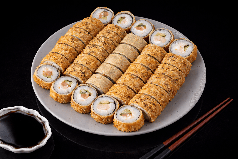 2 porsiya somon tempura, qarides tempura, krab tempura və toyuq tempura