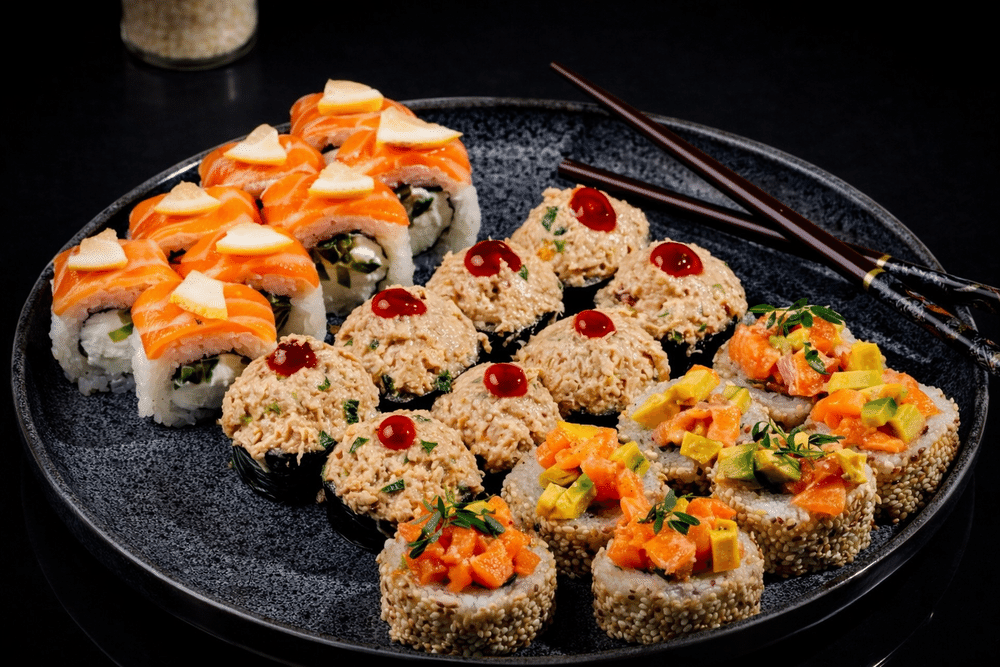 Filadelfiya, küncütlü, somonlu və avokadolu roll, Toyuq Spays