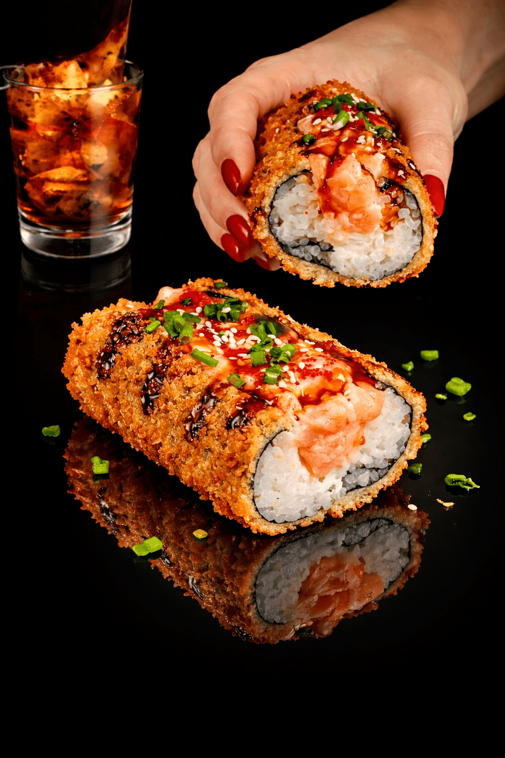 Somon, krem pendir, masago kürüsü, unagi və sweet chili sousu, yaşıl soğan və küncüt